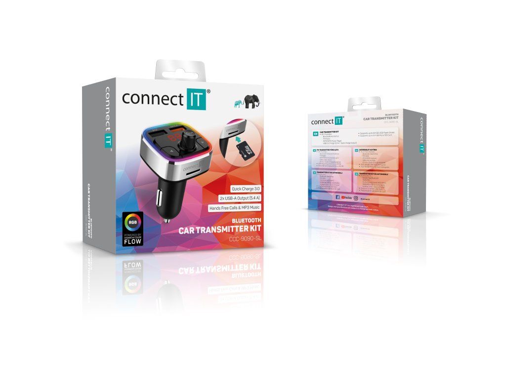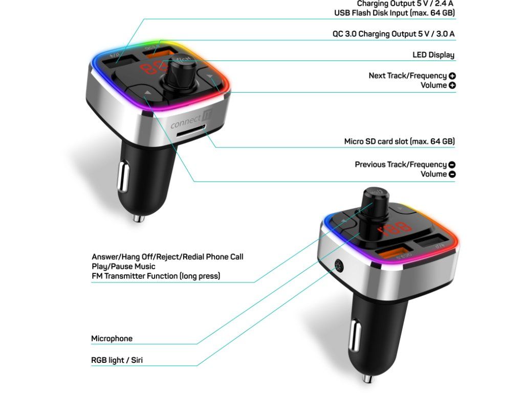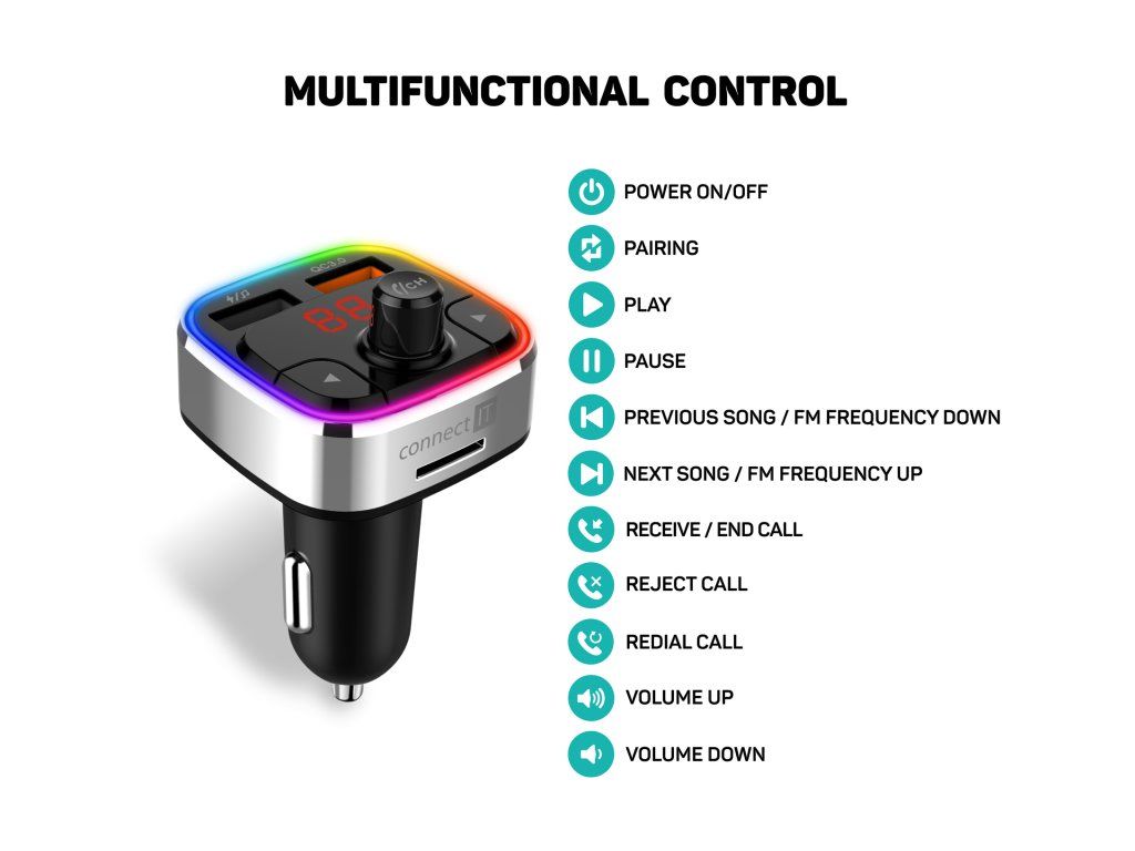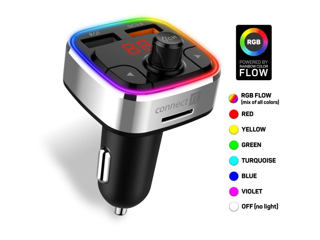 Multifunkční zařízení do automobilu kombinující Bluetooth transmitter, handsfree a rychlou autonabíječku. Connect IT CarRGB je praktický FM transmitter určený pro použití v zásuvce automobilového zapalovače. Umožňuje bezdrátové přehrávání hudby z mobilního telefonu, handsfree telefonování i nabíjení mobilních zařízení během jízdy.