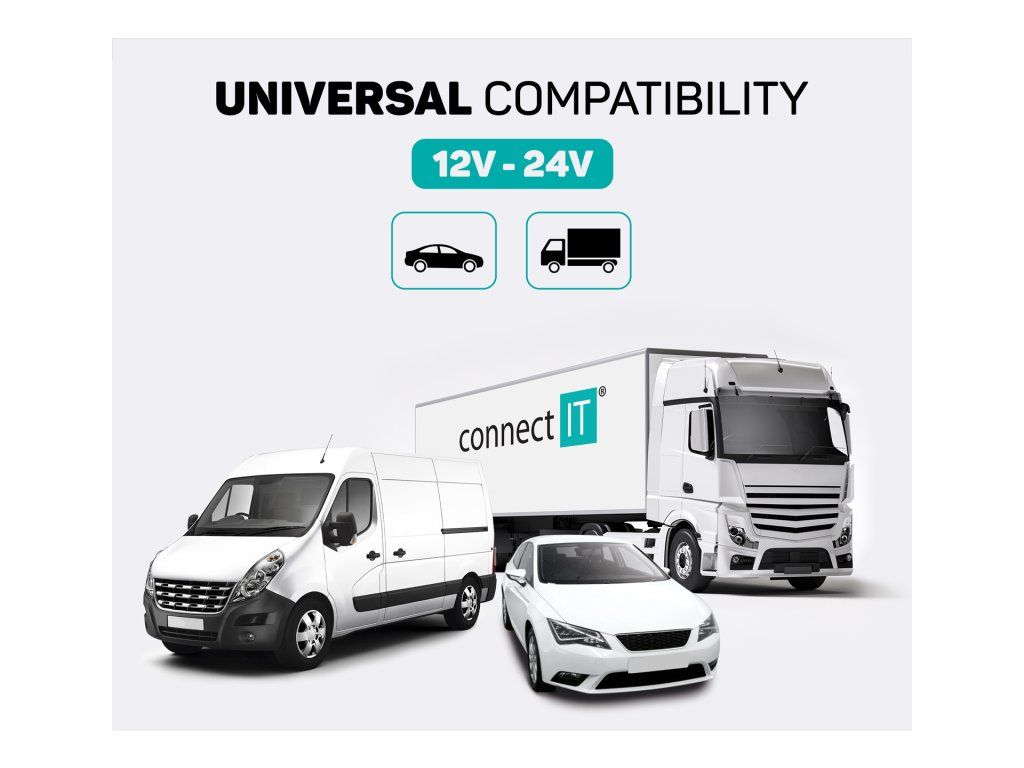Transmitter je navržen pro použití ve vozidlech s napětím 12 V i 24 V, takže jej lze používat jak v osobních automobilech, tak například v nákladních vozech nebo karavanech. Zařízení je vybaveno několika ochrannými prvky, které pomáhají chránit připojená zařízení i samotný transmitter. Patří mezi ně ochrana proti zkratu, přetížení, přehřátí nebo přebití.