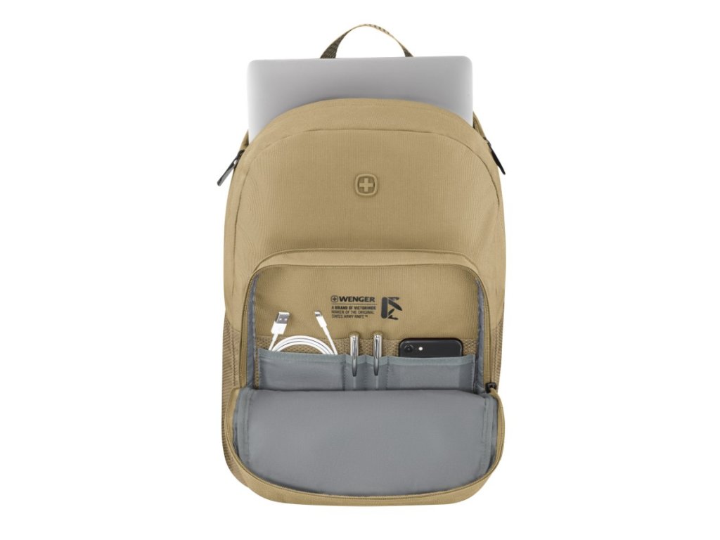 Wenger Crango nabízí polstrovanou přihrádku pro notebook do 16" a samostatnou přepážku na dokumenty. Praktický Essentials organizér udrží nabíječky, kabely a drobnosti přehledně uspořádané, takže budete mít vše vždy po ruce.