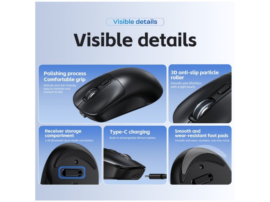 Praktická bezdrátová myš s dvojím režimem připojení, tichými tlačítky a moderním USB-C nabíjením. T-Wolf Q3 Dual Mode je navržena pro uživatele, kteří chtějí pohodlnou a univerzální myš bez zbytečných kabelů. Díky podpoře 2.4 GHz bezdrátového připojení i Bluetooth nabízí větší flexibilitu při používání doma, v kanceláři i na cestách. Hodí se pro běžnou práci, studium i každodenní ovládání notebooku nebo počítače.