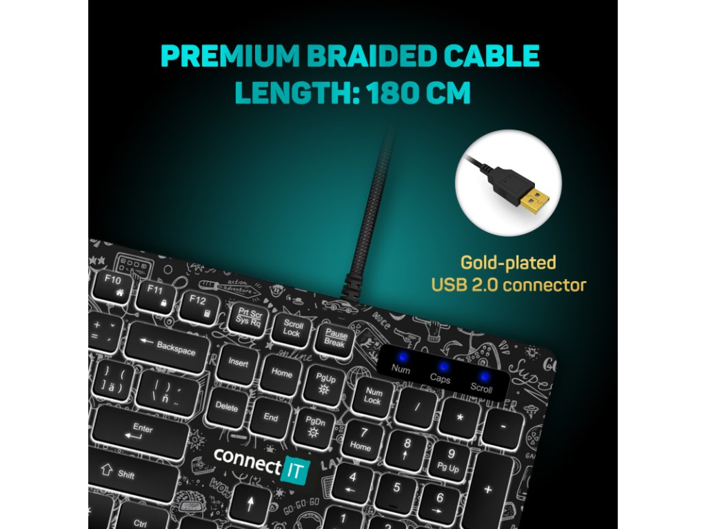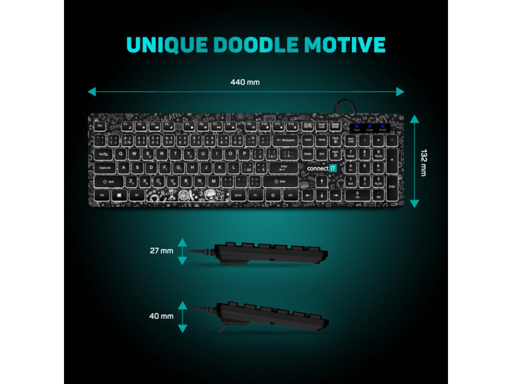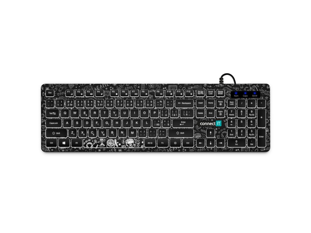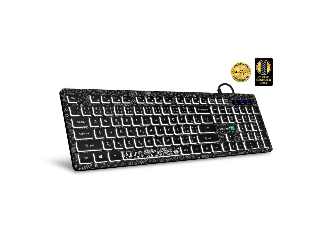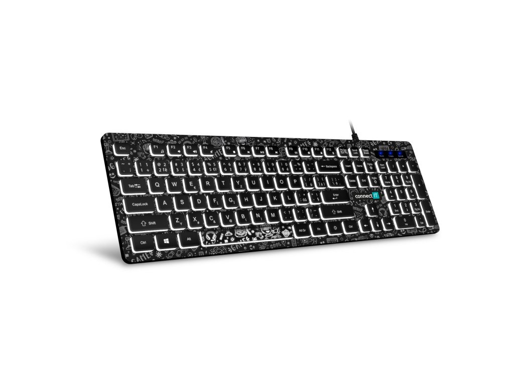 Connect IT Doodle kancelářská drátová bíle podsvícená USB klávesnice, CZ/SK - černá