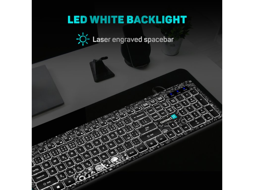 Design, který si zamilujete. Komfort, který oceníte. Tato podsvícená klávesnice Connect IT DOODLE Office spojuje funkčnost, pohodlí a originální styl. S bílým LED podsvícením, tichým chodem kláves a speciálním DOODLE motivem na mezerníku je ideální pro práci, studium i každodenní komunikaci.