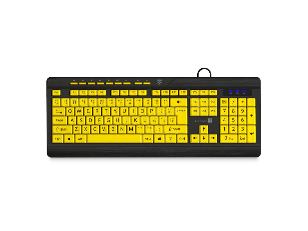 Výrazné barvy, snadné psaní a pohodlí pro každého. Tato kontrastní klávesnice je ideální volbou pro uživatele s horším zrakem, seniory, děti nebo kohokoli, kdo ocení větší písmo a jasné odlišení kláves. Žluté popisky na černém podkladu zajišťují maximální čitelnost za jakýchkoliv světelných podmínek.