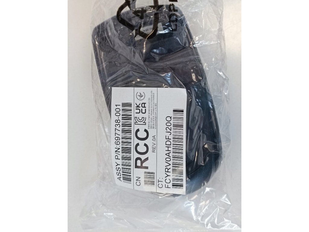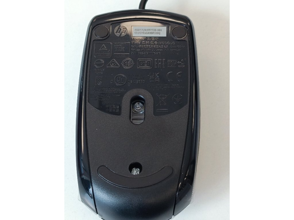 Drátová optická myš, která se připojuje k počítači pomocí USB portu. Má černou barvu a tři tlačítka: levé, pravé a kolečko. PN 697738-001