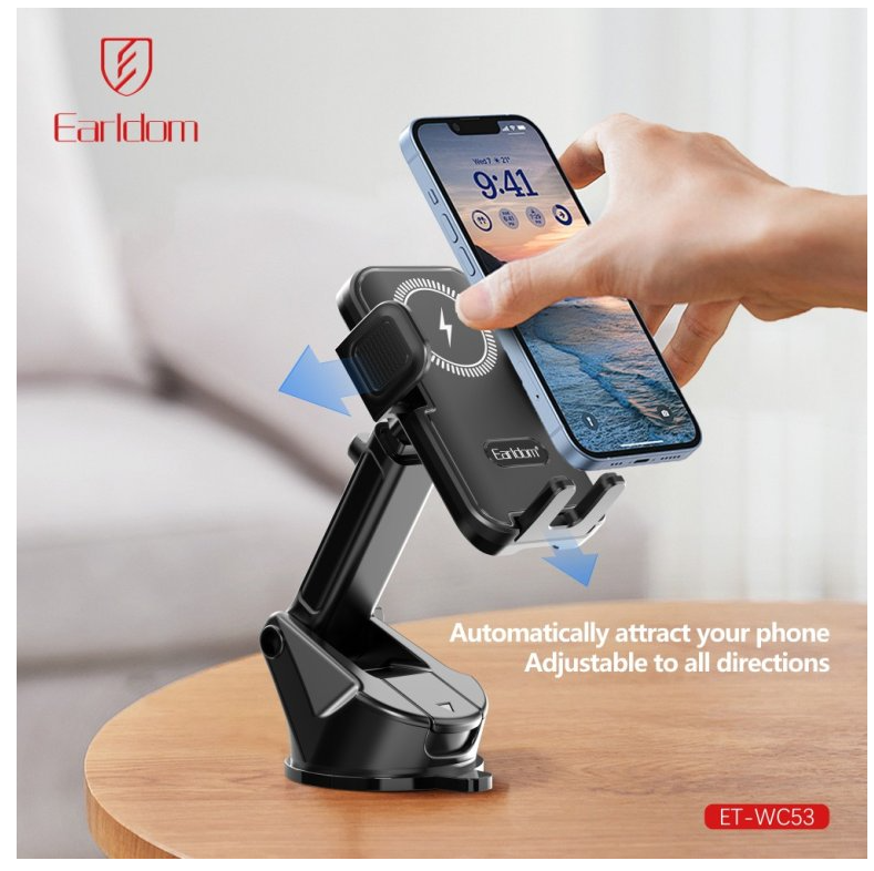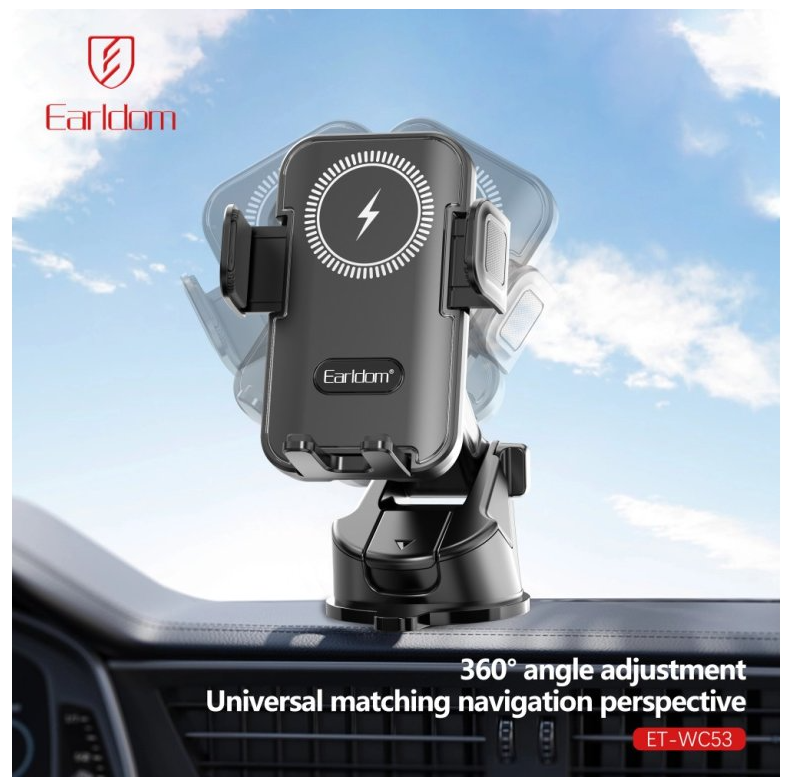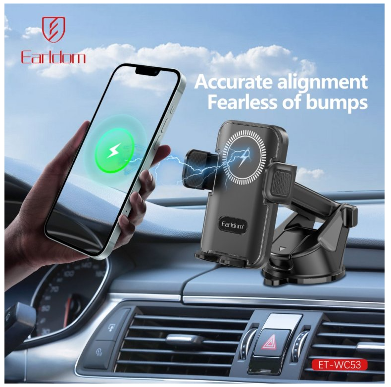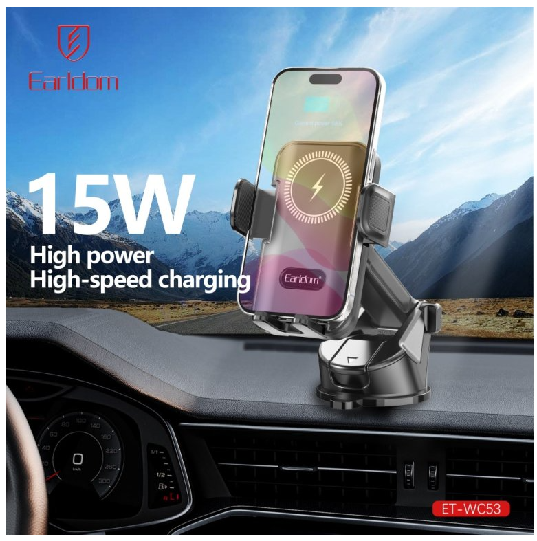 Univerzální držák na telefon Earldom ET-WC63 s bezdrátovým nabíjením 15 W nabízí pevné uchycení, jednoduché ovládání a rychlé nabíjení během jízdy. Snadná montáž na palubní desku pomocí vakuového upevnění.