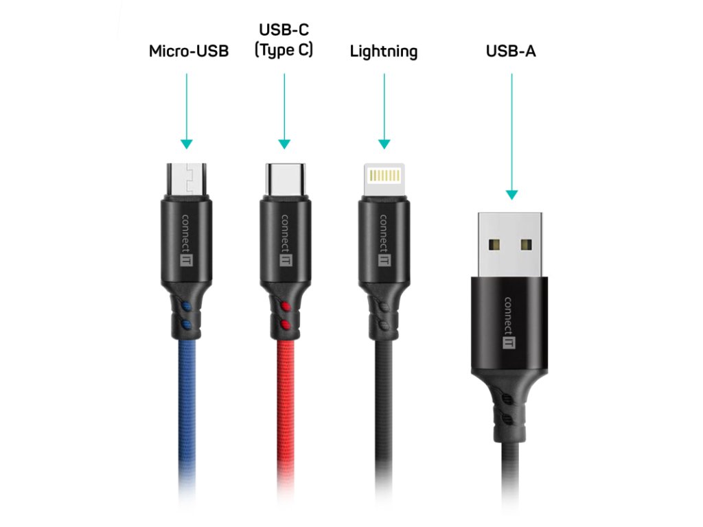 - Konektory: USB-C, Lightning, Micro USB