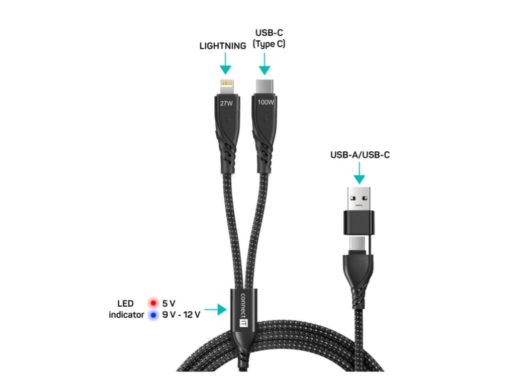 Praktický kabel pro současné nabíjení dvou zařízení s USB-C a Lightning konektory. Univerzální datový a nabíjecí kabel Connect IT Wirez 4v1 umožňuje rychlé a bezpečné napájení s maximálním proudem až 5 A. Díky redukci z USB-C na USB-A ho využijete s moderními i staršími zařízeními.
