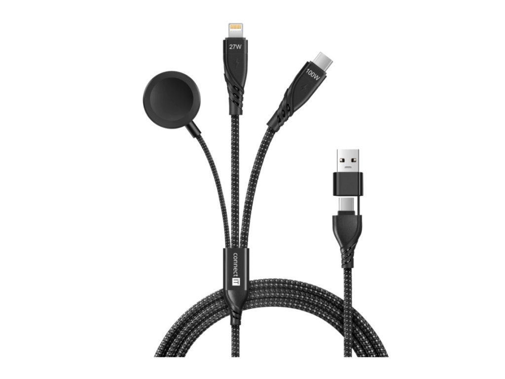 Connect IT Wirez Datový kabel 6v1, USB-C, Lightning, Watch charger, 1,25 m – černá