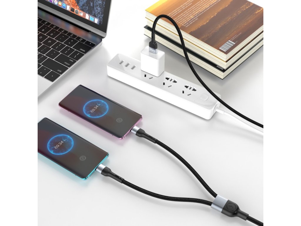 Díky dvěma výstupním konektorům USB-C můžete současně připojit dvě zařízení, jako jsou telefony, tablety nebo příslušenství. Kabel podporuje také rychlé nabíjení a je dostatečně odolný pro každodenní používání.