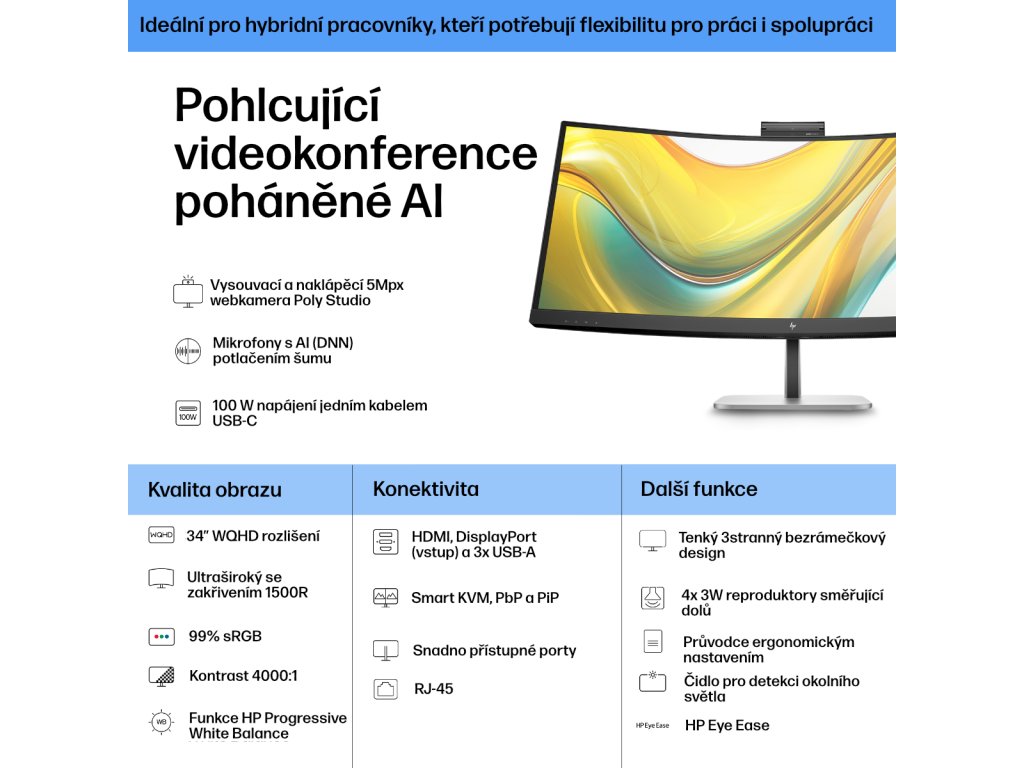 Ultrawide monitor navržený pro moderní videokonference HP Series 5 Pro 534pm nabízí širokoúhlou zakřivenou obrazovku, která skvěle kombinuje produktivitu a čistý design. Ideální pro uživatele, kteří potřebují prostor pro multitasking a pohodlí při online setkáních – vše v jednom elegantním balení bez externích zařízení.