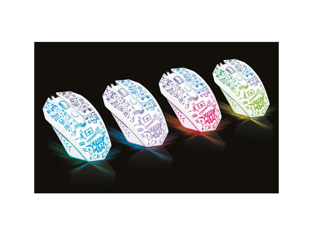 Myš je vybavena ergonomickým tělem, které přirozeně padne do každé ruky a umožní komfortní používání i po delší dobu. Povrch Soft Touch zabraňuje pocení a zvyšuje pohodlí při hraní her i běžné práci. Pestrobarevné LED podsvícení propouštějící světlo skrz drobné grafické motivy dodává myši originální a hravý vzhled.