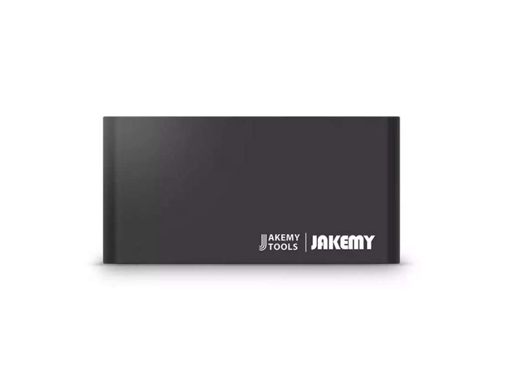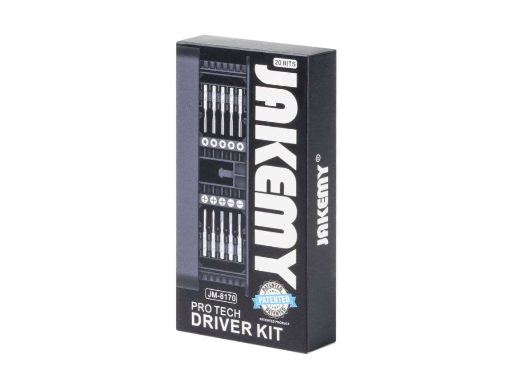 Jakemy JM-8170 je sada šroubováků a bitů, která obsahuje 20 kusů různých typů bitů, jako jsou Torx, Flat-head, Philips, Tri-Wing, Pentalobe a Stand off. Bity jsou vyrobeny z S2 oceli a mají černou barvu. Šroubovák je vyroben z lehkého hliníku a má protáčející koncovku rukojeti s kuličkovým ložiskem pro snadné šroubování. Sada je vhodná pro opravu drobné elektroniky na cestách nebo u zákazníka. Sada je dodávána v praktickém balení s organizérem bitů.