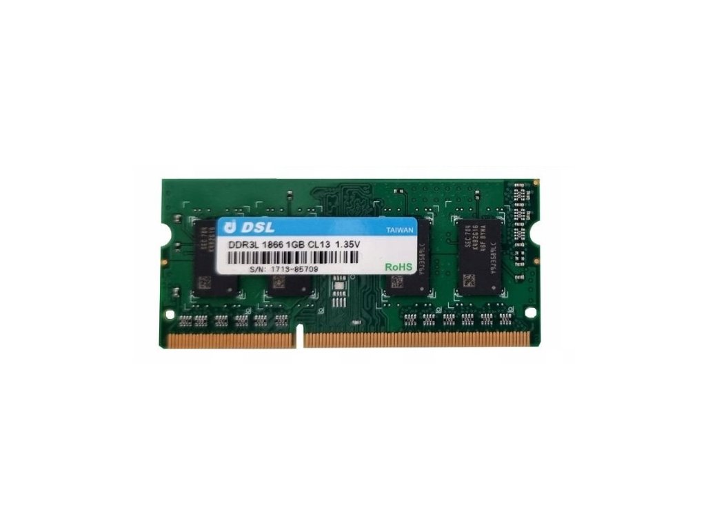 Operační paměť DSL s kapacitou 1 GB, typ DDR3L, pracující na frekvenci 1866 MHz a s časováním CL13. Tento modul je určen pro použití v noteboocích a kompaktních zařízeních, která podporují SODIMM paměťové sloty.