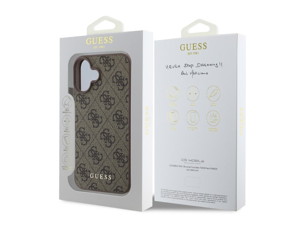 Prémiový zadní kryt Guess 4G Charm se vyznačuje elegantním, charakteristickým 4G vzorem, doplněným o zlaté logo GUESS.