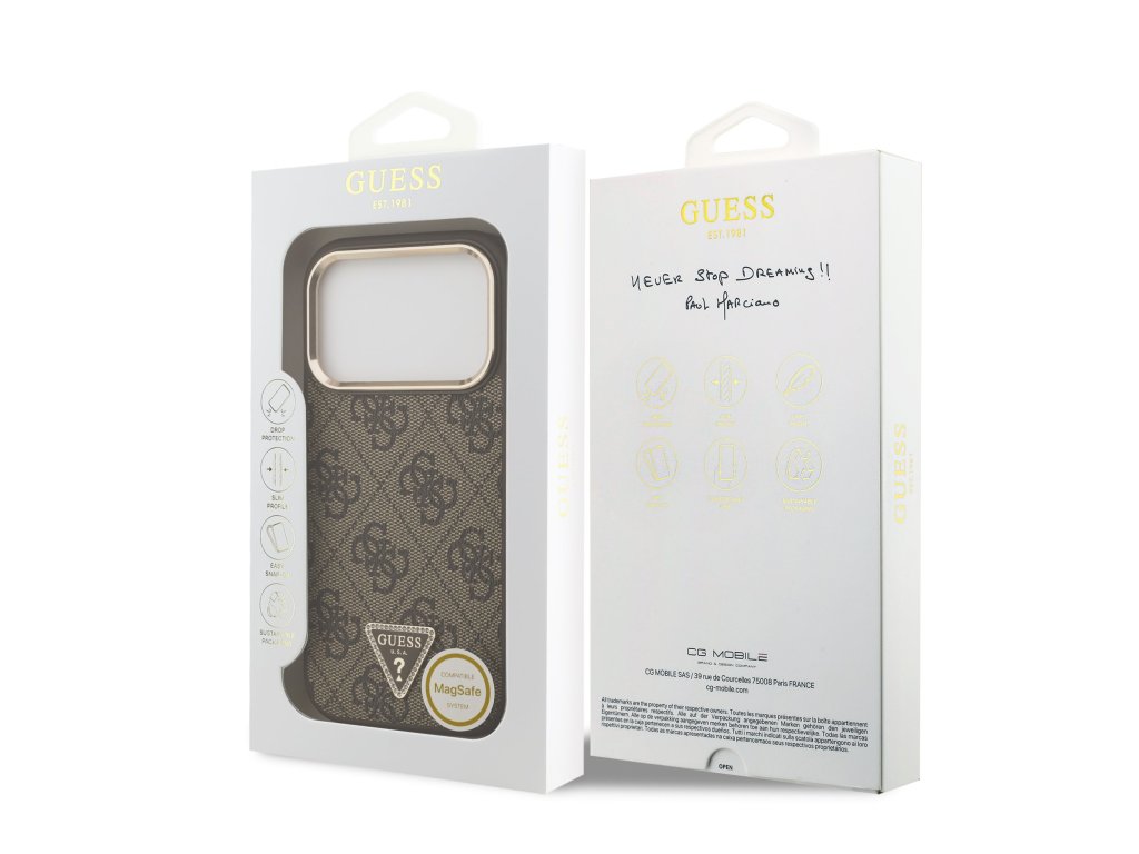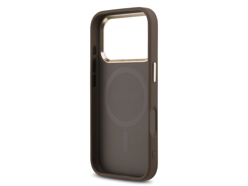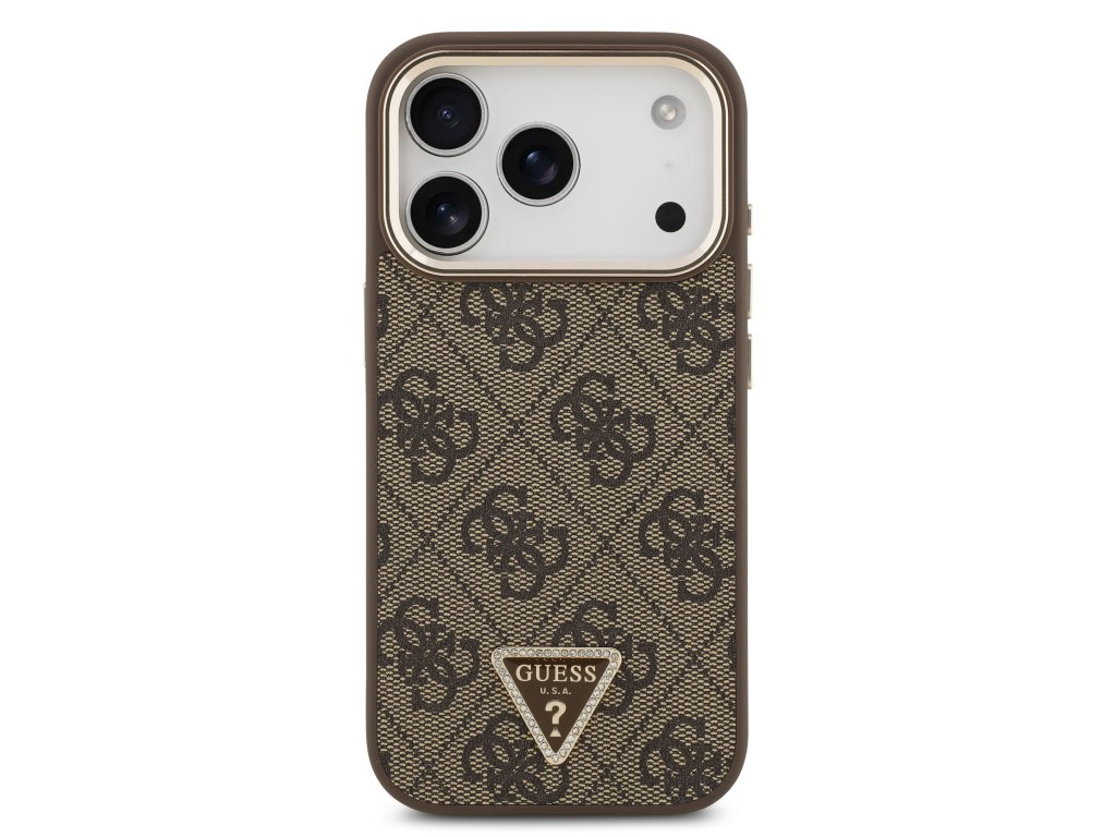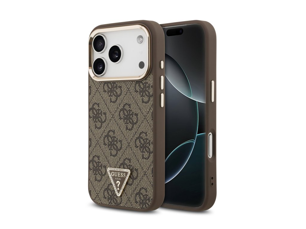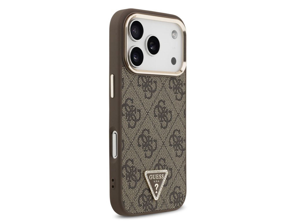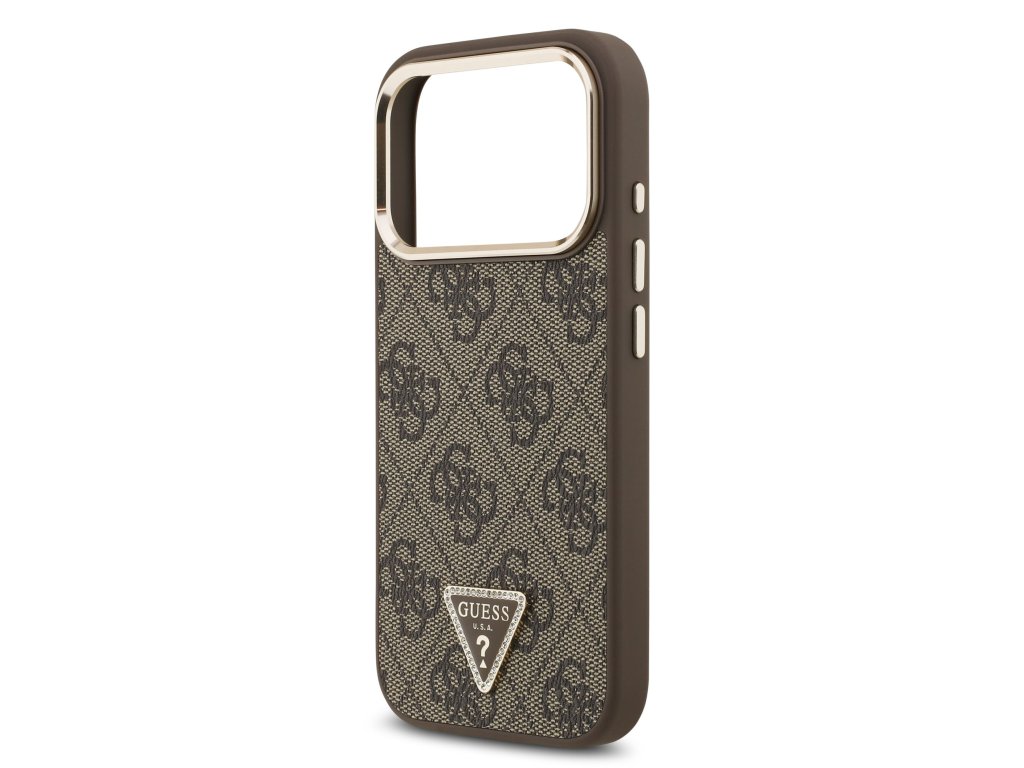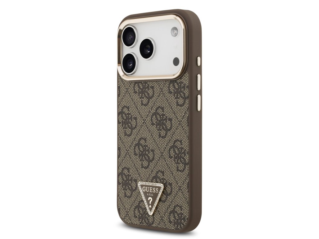 Guess PU Leather 4G Strass Triangle Logo Gold Frame MagSafe Zadní Kryt pro iPhone 17 Pro – hnědá