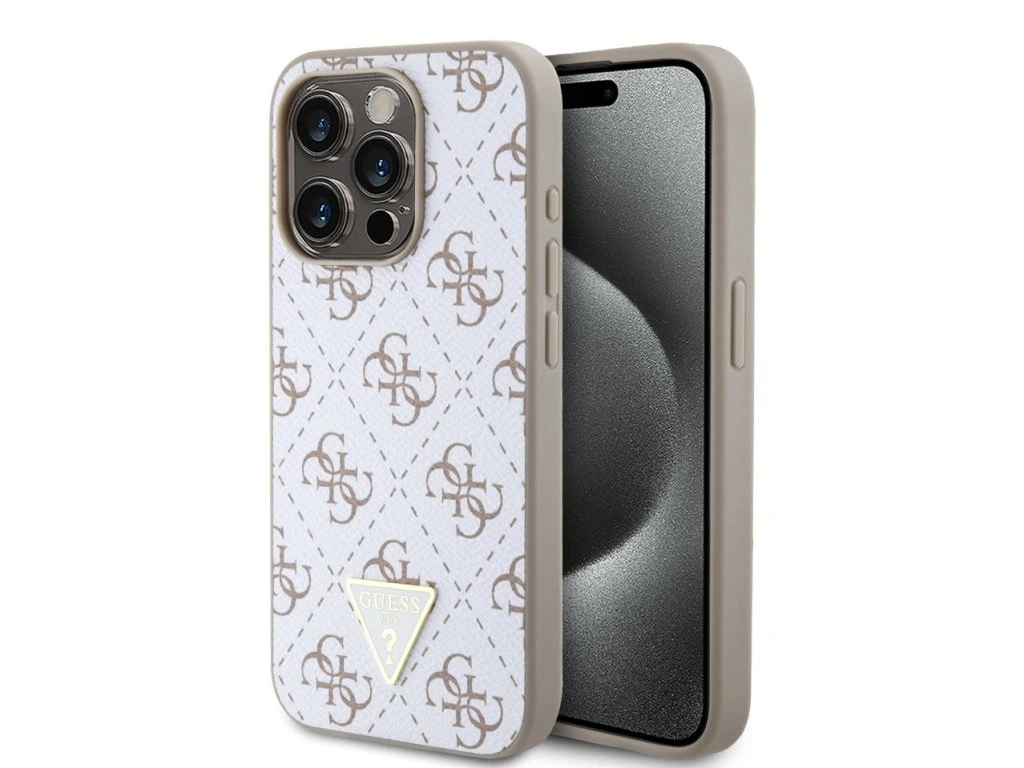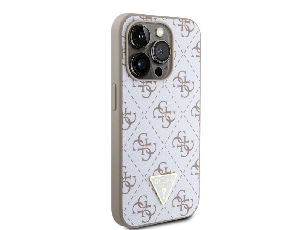 Guess PU Leather 4G Triangle Metal Logo Zadní Kryt pro iPhone 15 Pro White