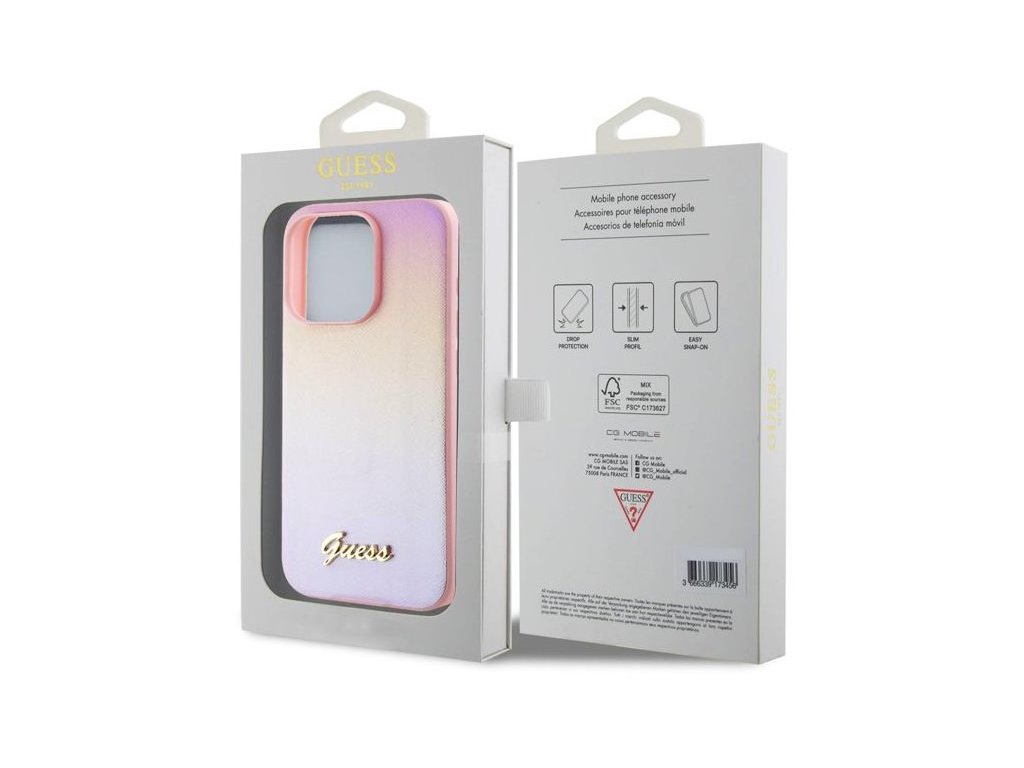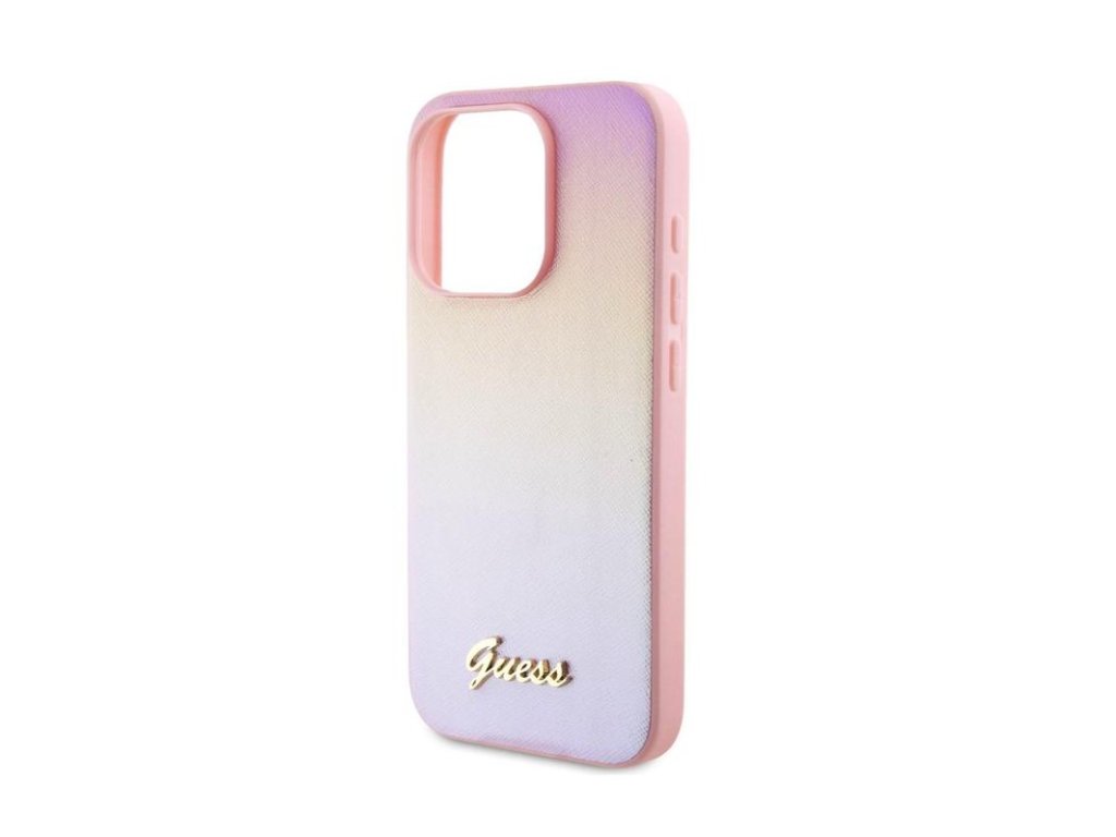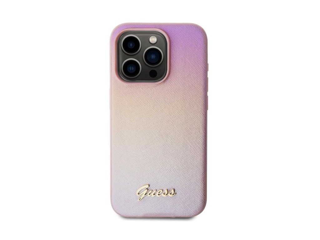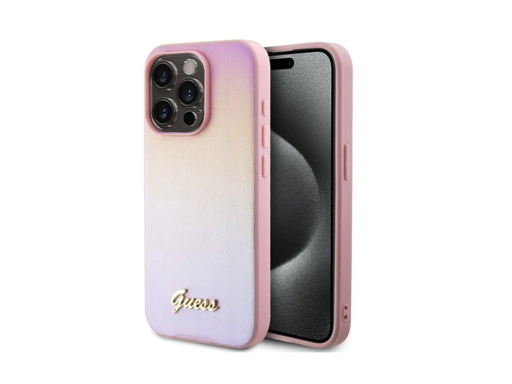 Guess PU Leather Iridescent Metal Script Zadní Kryt pro iPhone 15 Pro Max Pink