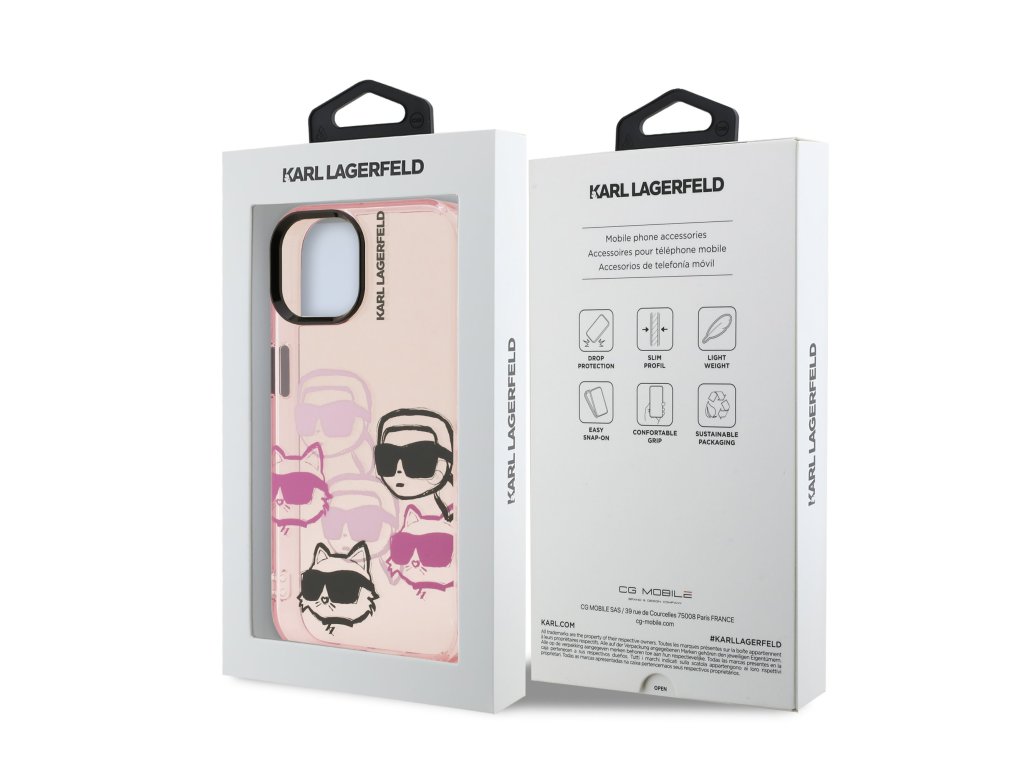 Kryt zaujme ikonickým vzorem hlav Karla Lagerfelda a jeho kočky Choupette v kombinaci růžových a černých tónů. Tento motiv působí odvážně, stylově a dodává telefonu originální vzhled, který se neztratí v davu.