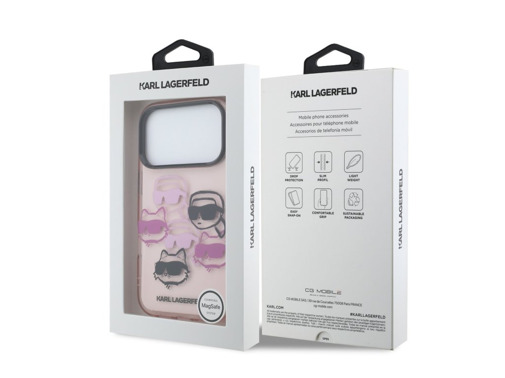 Kryt zaujme ikonickým vzorem hlav Karla Lagerfelda a jeho kočky Choupette v kombinaci růžových a černých tónů. Tento motiv působí odvážně, stylově a dodává telefonu originální vzhled, který se neztratí v davu.