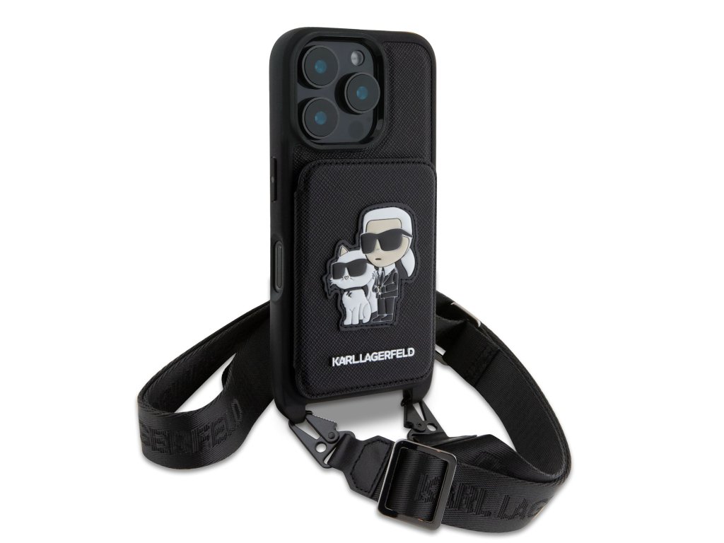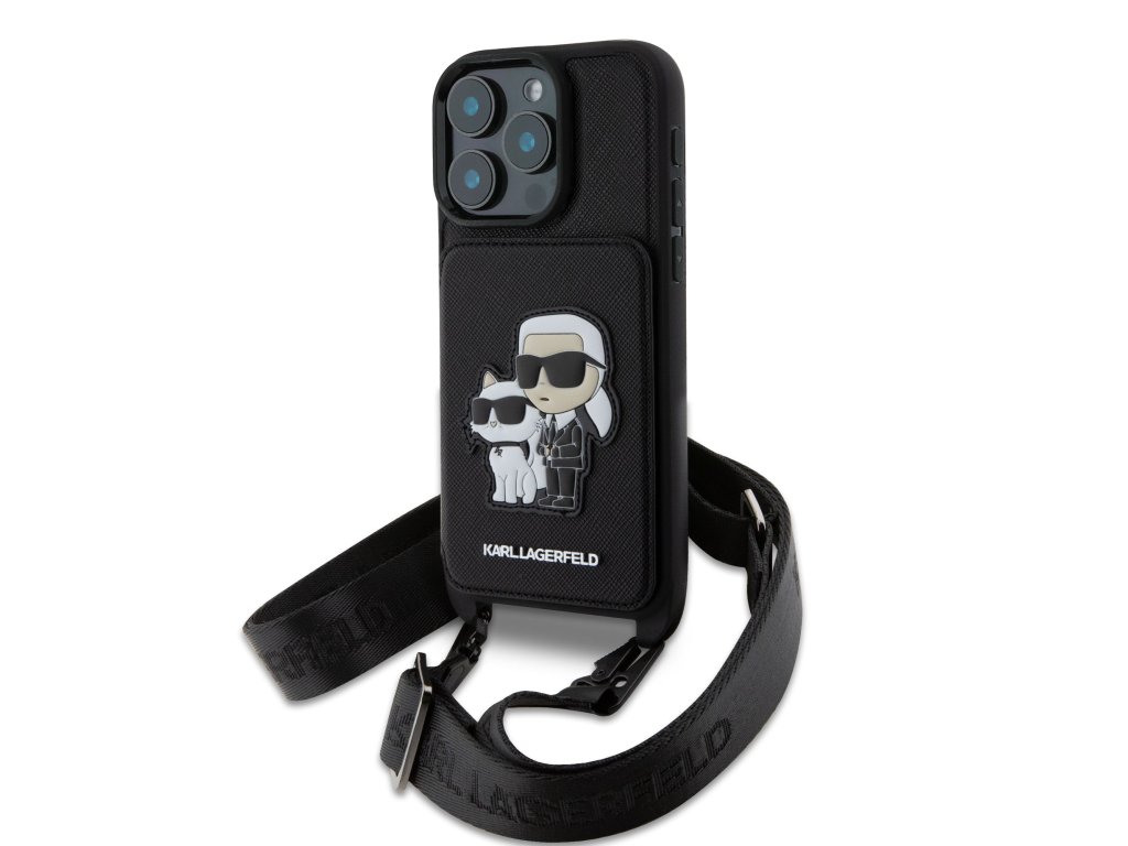 Karl Lagerfeld Saffiano Crossbody popruh Karl and Choupette kryt pro iPhone 16 Pro – černá