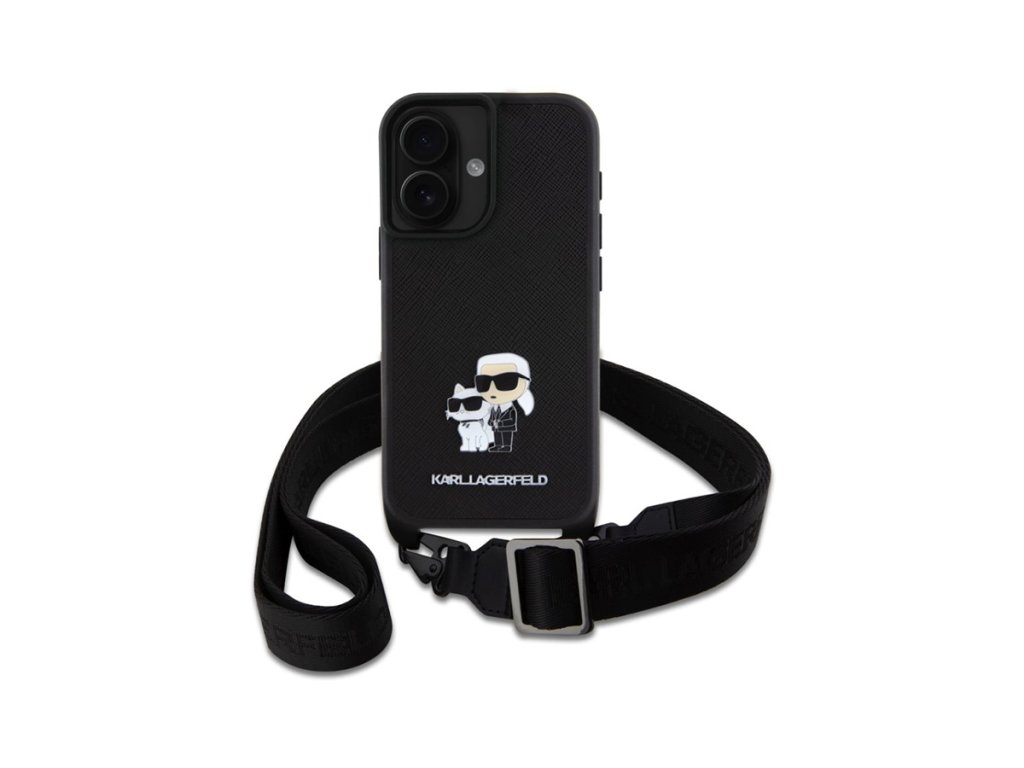 Karl Lagerfeld Saffiano Crossbody Popruh Metal Karl and Choupette Zadní Kryt pro iPhone 16 Černá