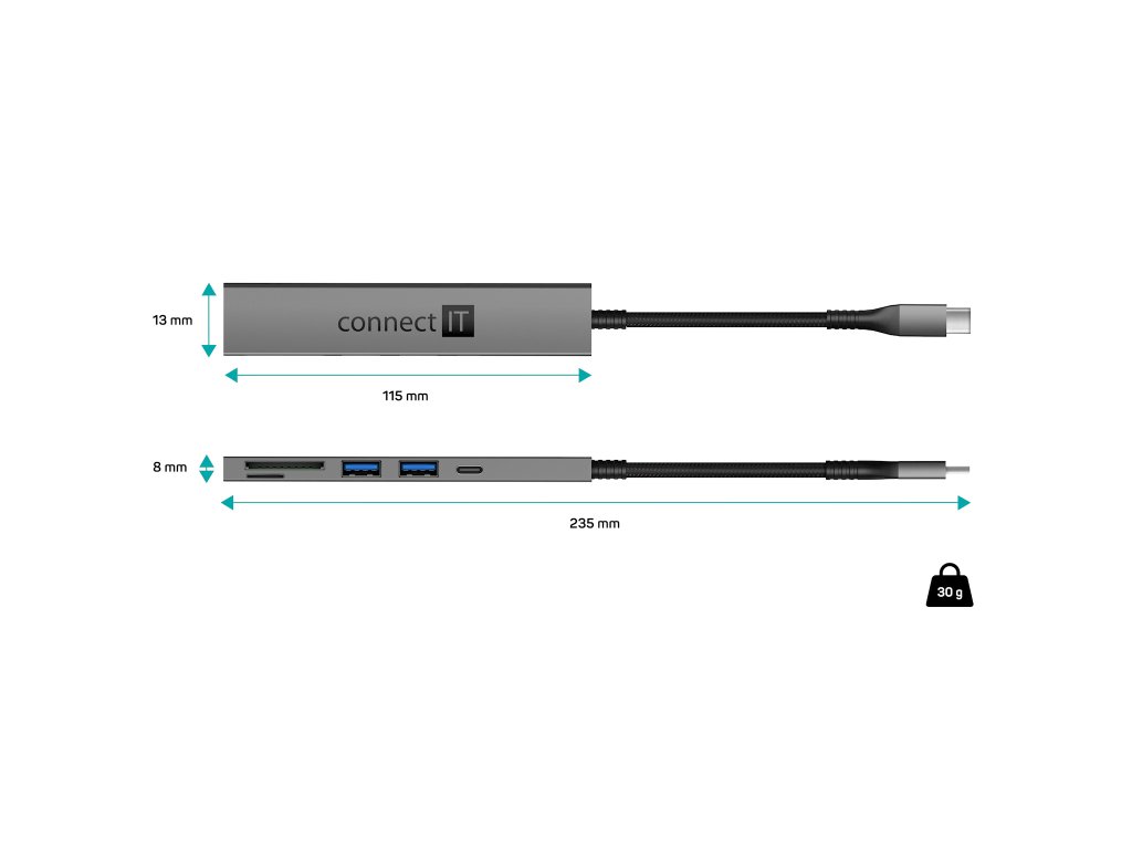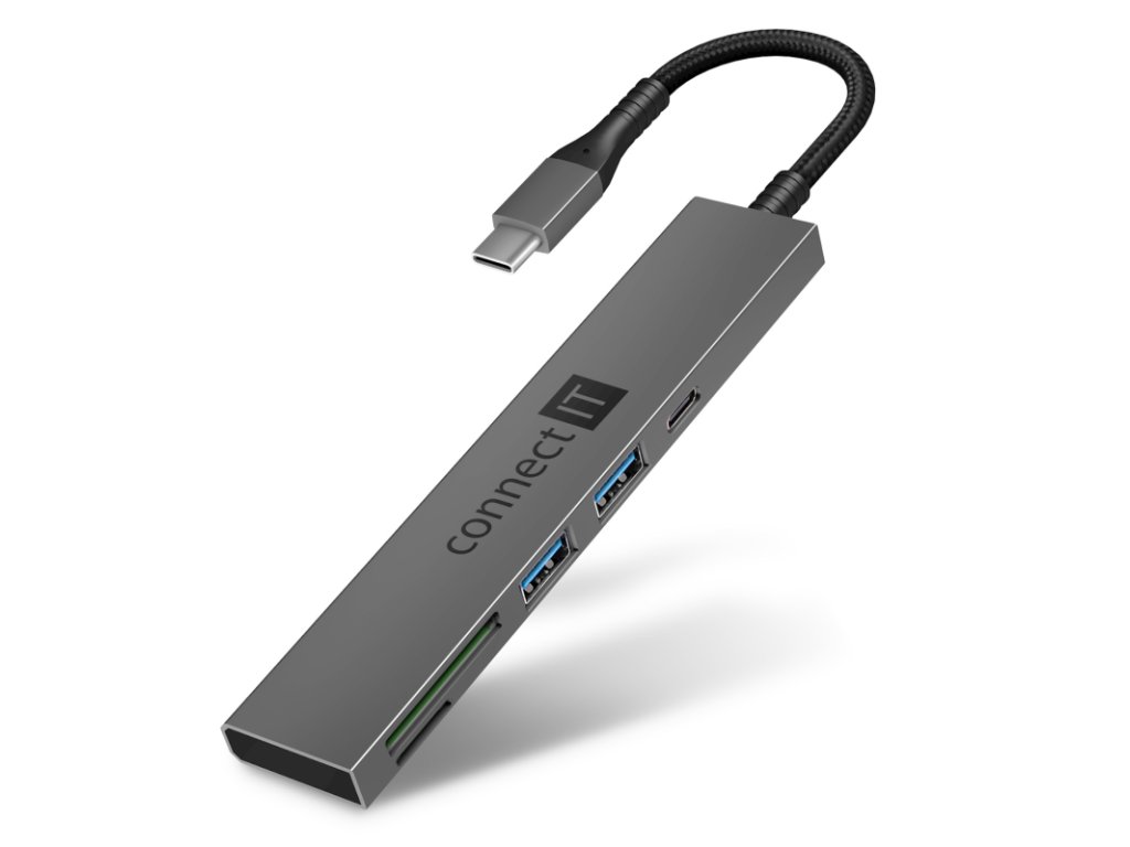 Connect IT Compact PRO USB-C hub + čtečka karet (2xUSB-A 3.0, 1xUSB-C) - šedá