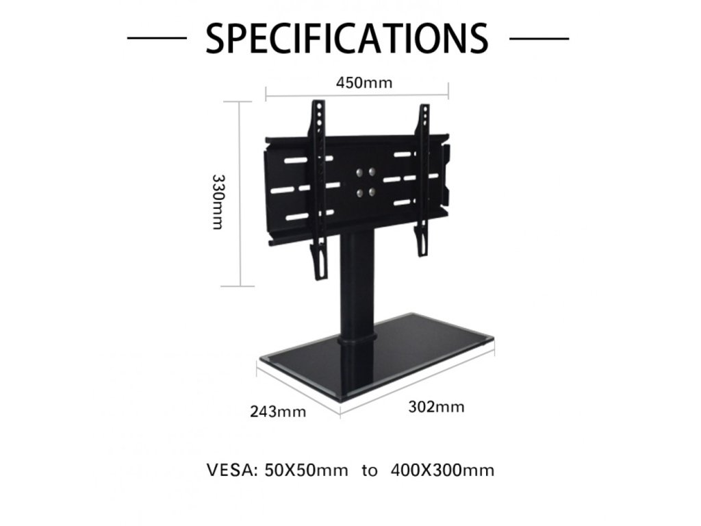 Stolní TV stojan pro úhlopříčky 26″–42″ s výškovým nastavením a stabilní konstrukcí. Elegantní černé provedení, VESA až 400×300 mm. Stylové a stabilní řešení pro umístění televizoru bez vrtání do zdi.