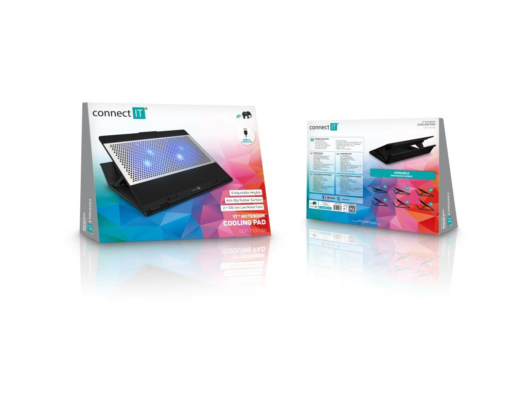 Connect IT FrostBlast je chladicí podložka navržená pro efektivní snížení teploty notebooků do velikosti 15,6". Kombinuje aktivní chlazení pomocí dvou velkých ventilátorů, hliníkovou chladicí mřížku a promyšlenou konstrukci, která podporuje přirozený odvod tepla z pláště notebooku i jeho ventilačních otvorů. Výsledkem je stabilnější chod zařízení a komfortnější práce i při vyšší zátěži.