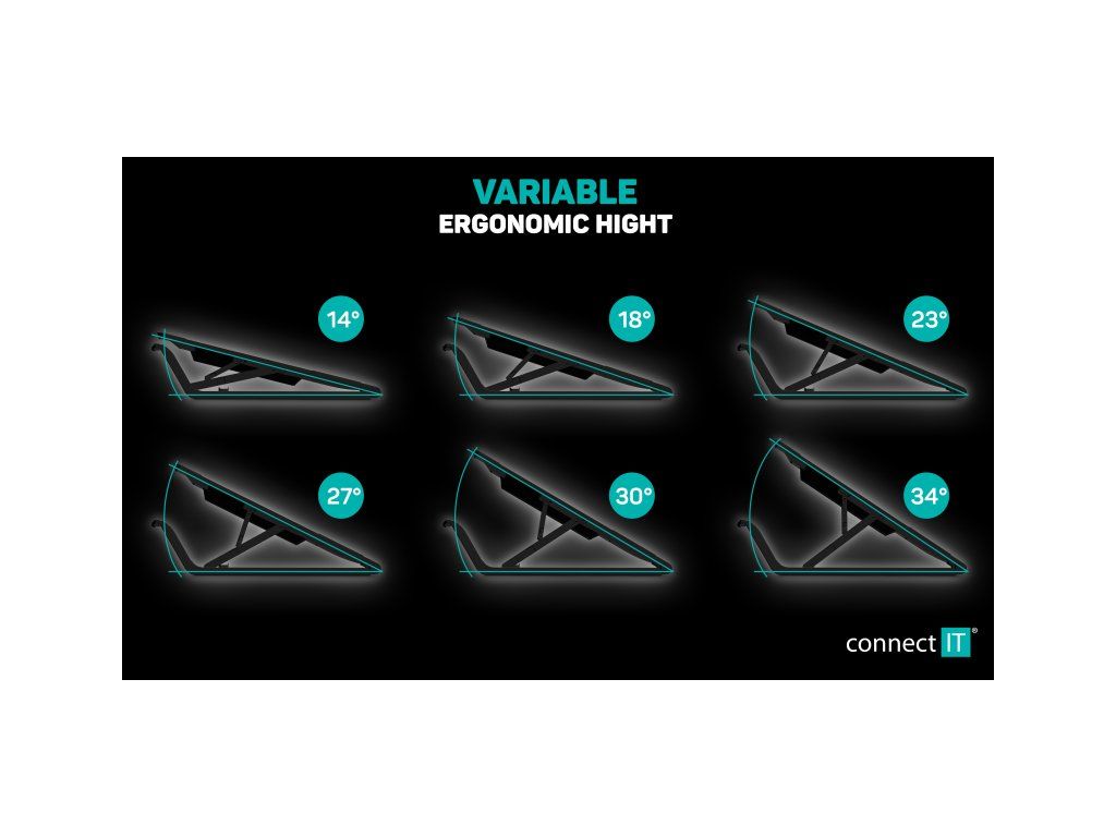 Díky šestistupňovému výškovému polohování lze podložku nastavit do úhlů 14°, 18°, 23°, 27°, 30° nebo 34°. To zlepšuje ergonomii při psaní, práci s myší i dlouhodobém sledování obrazovky. Široké protiskluzové pěnové nožky zajišťují stabilitu podložky na pracovním stole a zabraňují nechtěnému pohybu.