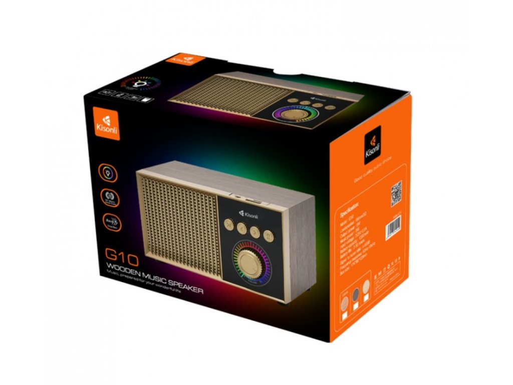 Kisonli G10 je kompaktní přenosný reproduktor s překvapivě silným zvukem a výrazným RGB podsvícením, které dodá atmosféru každému poslechu. Díky možnosti připojení přes Bluetooth 5.0, AUX, USB nebo SD kartu, nabízí široké možnosti využití v jakémkoliv prostředí. S výdrží až 5 hodin a vestavěným FM rádiem se stává ideálním společníkem na cesty i do kanceláře.